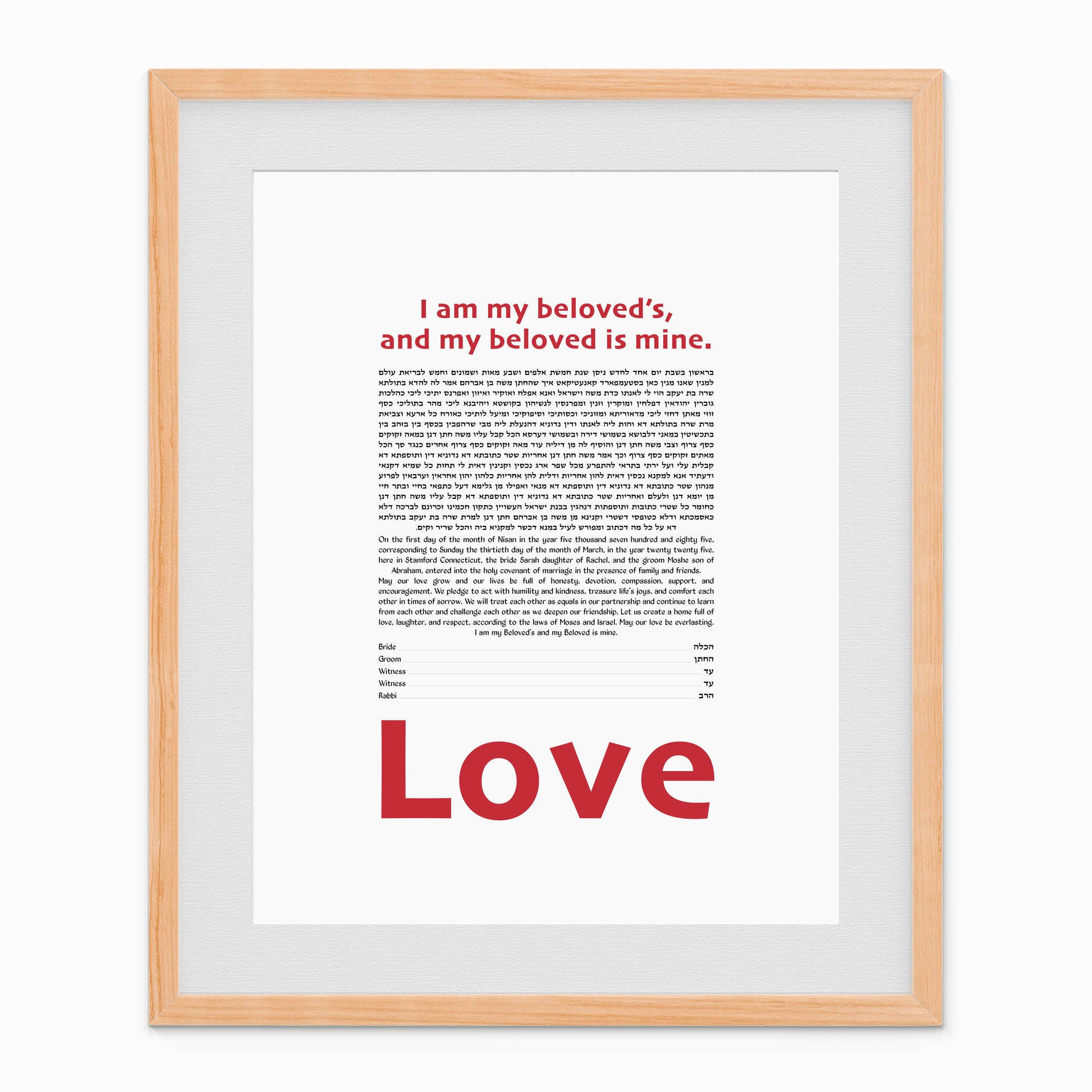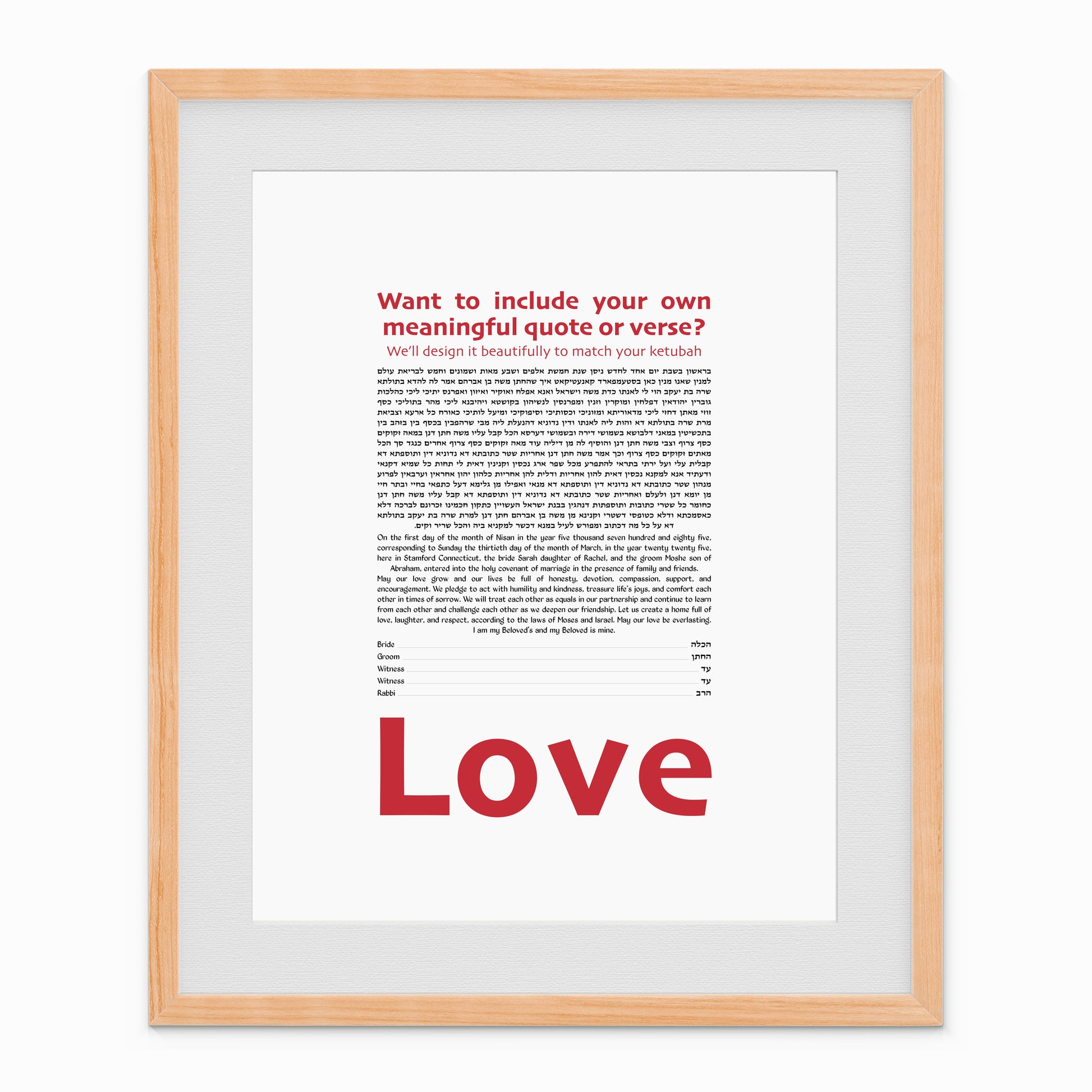Celebrate your love with a meaningful and modern ketubah design that expresses both devotion and joy. At the top, you can choose from three quote options, allowing you to select the wording that best reflects your relationship: