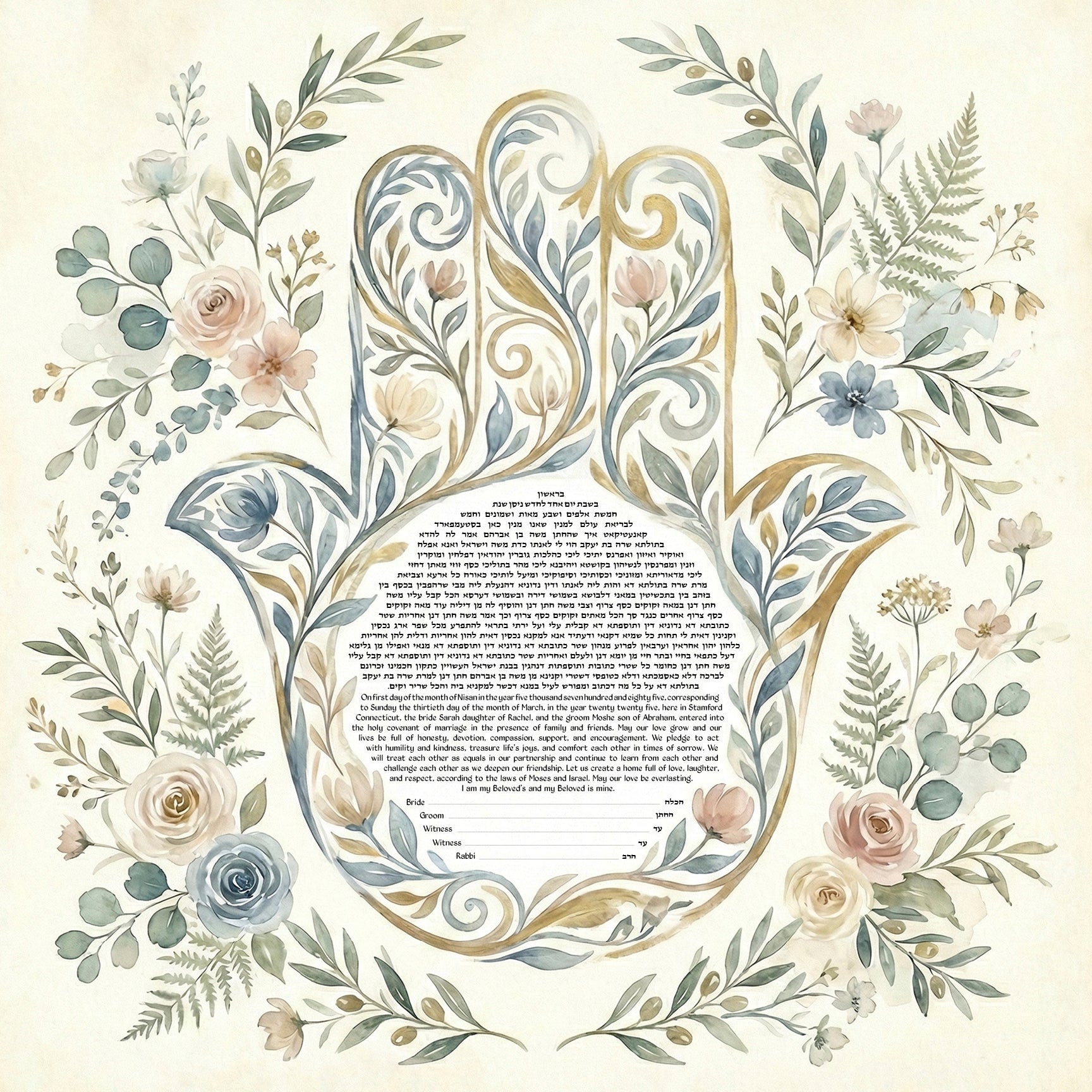This watercolor Hamsa ketubah centers on a large hand outlined in soft gold, filled with flowing vine and leaf patterns in muted pastel blues and greens. Surrounding florals are arranged as a loose, wreath-like frame, with fuller blooms at the base and lighter sprays rising along the sides and top to draw the eye inward. Roses, wildflowers, eucalyptus, olive branches, and ferns are layered to create depth while preserving open space so the design feels airy rather than dense. The pastel palette—dusty blue, sage green, blush pink, cream, and warm beige—sits on a warm ivory background with subtle gold accents for gentle contrast. The Hamsa, a traditional symbol of protection and blessing, adds meaningful spiritual significance while serving as the visual focal point of this ketubah design.