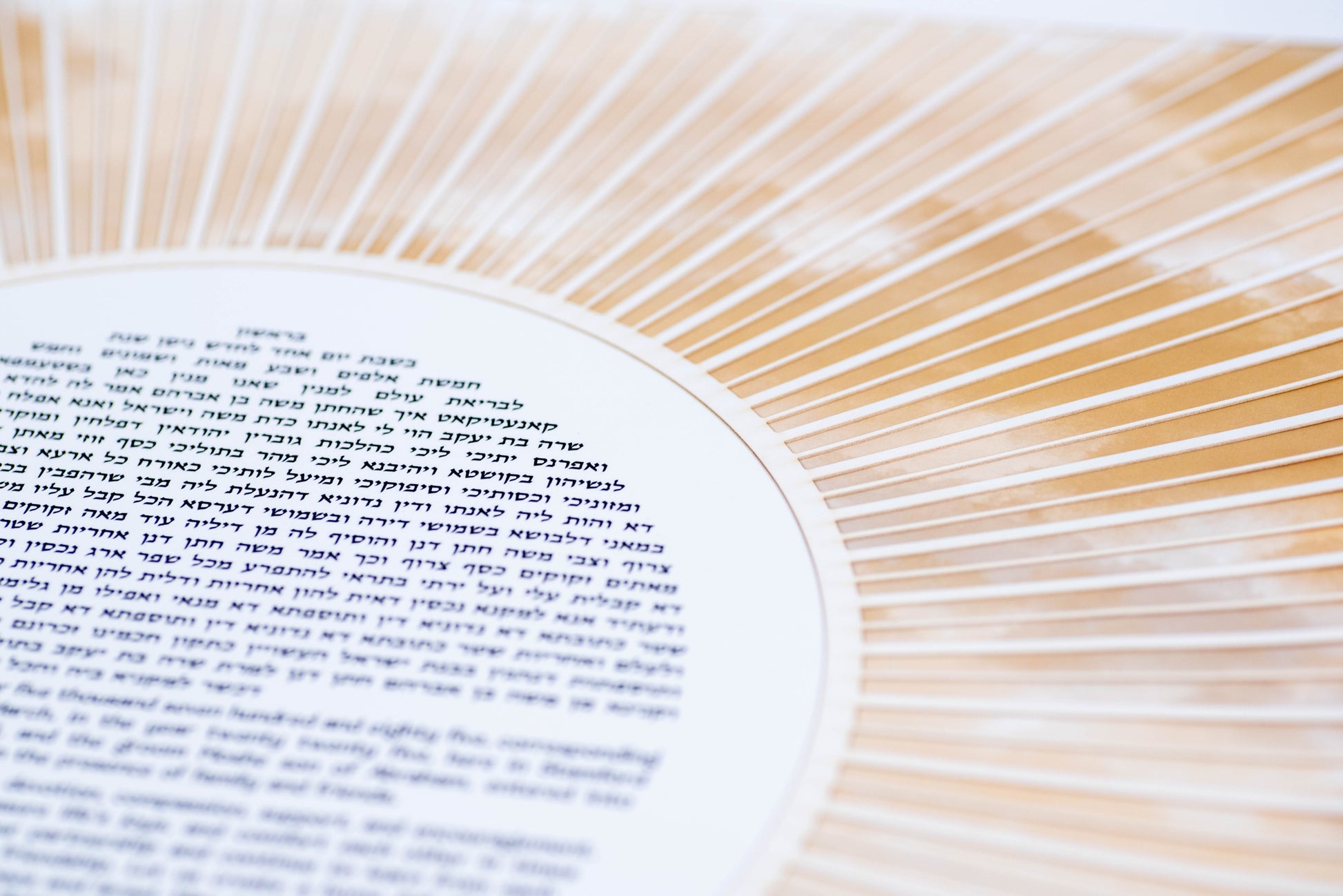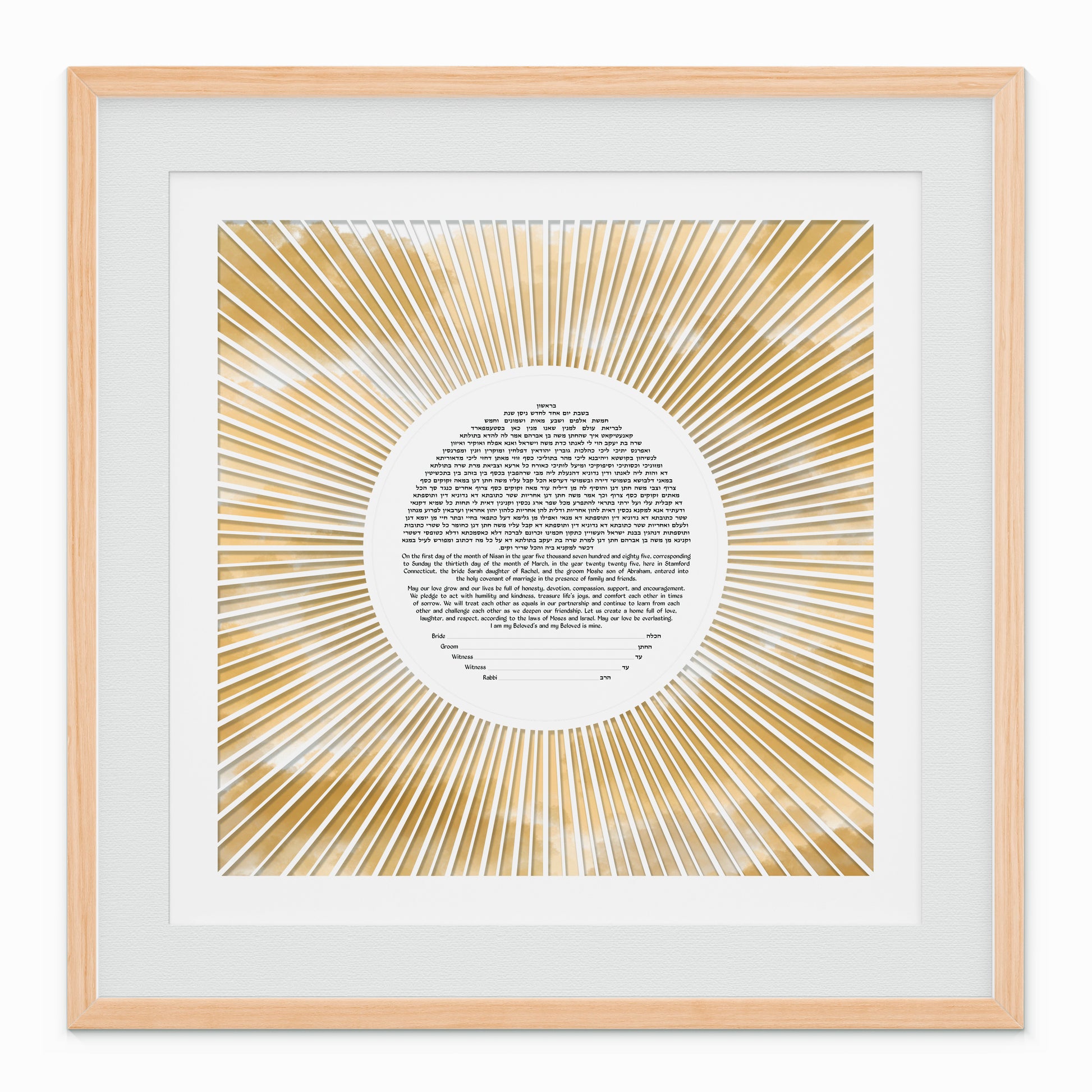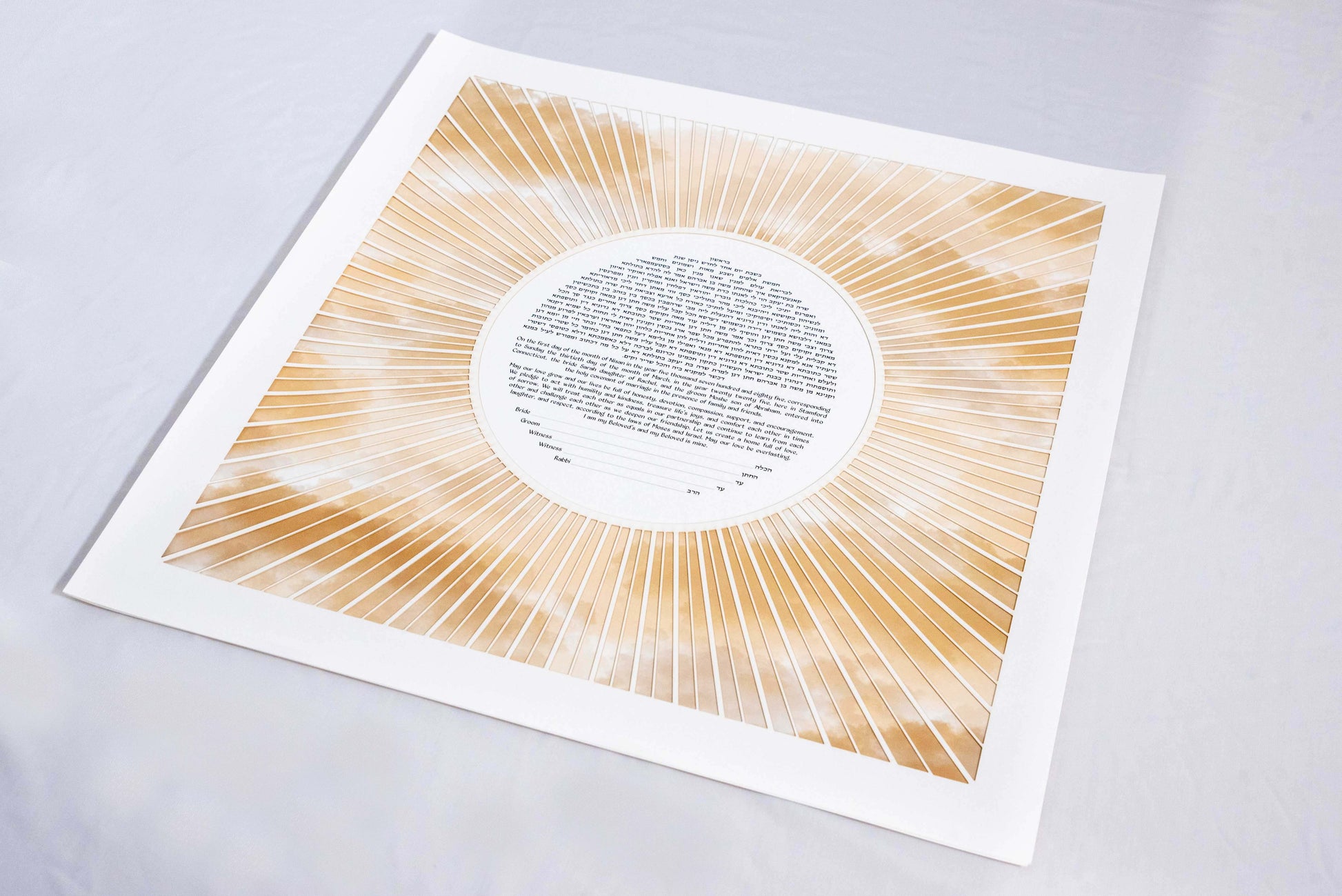 Capture the essence of your love with our Abstract Paper Cut Sun Ketubah. This exquisite artwork By Sara Michaeli. Features a radiant sun with intricately designed rays and clouds, symbolizing the warmth and beauty of your commitment. Fully customizable text in the language of your choice adds a personal touch to this unique ketubah, making it a cherished reflection of your union. Celebrate your special day with this timeless masterpiece