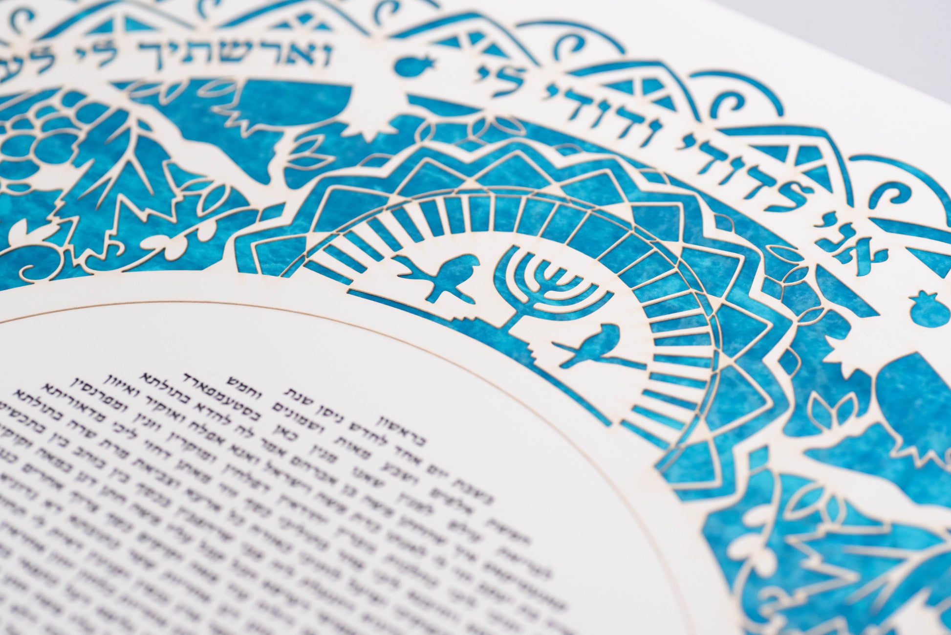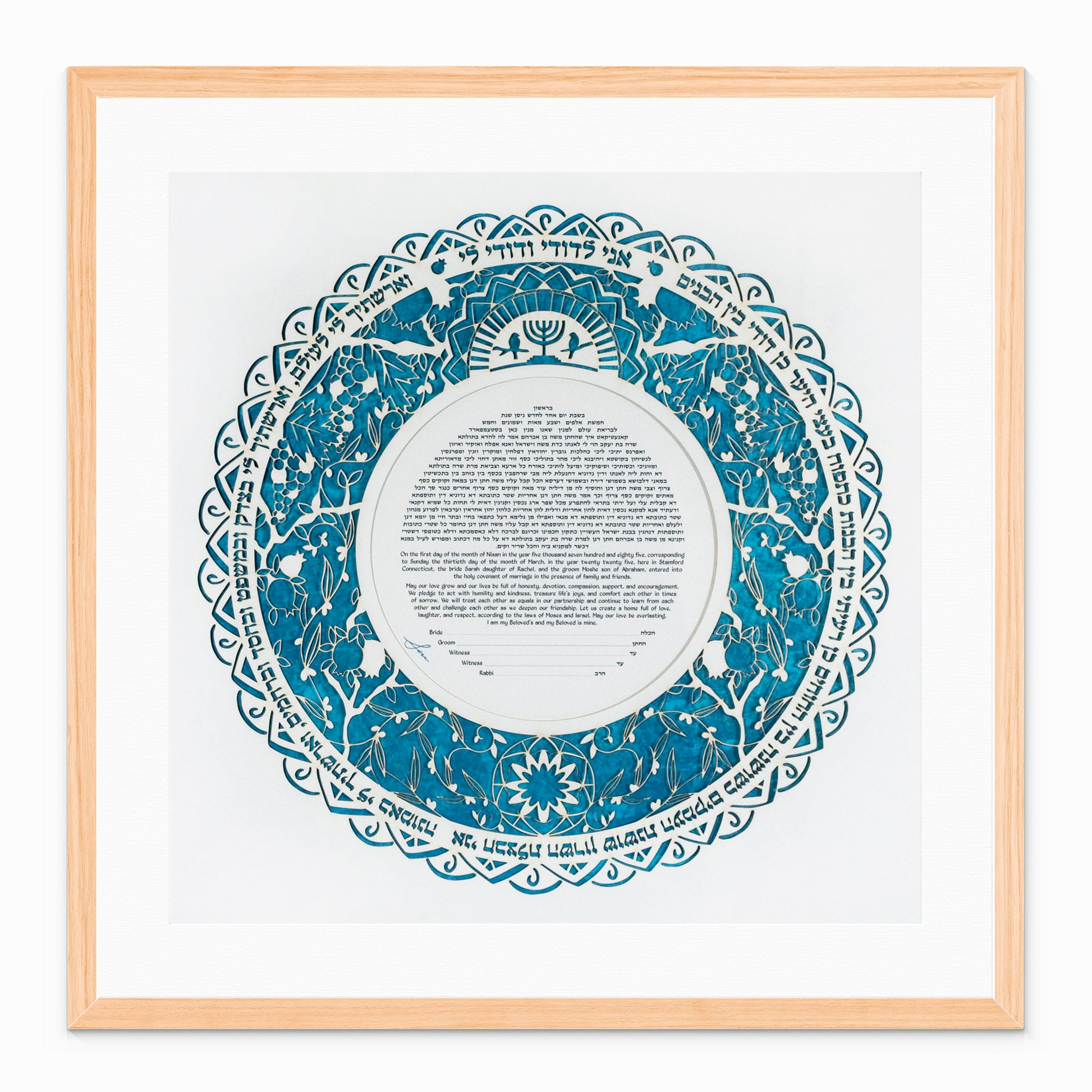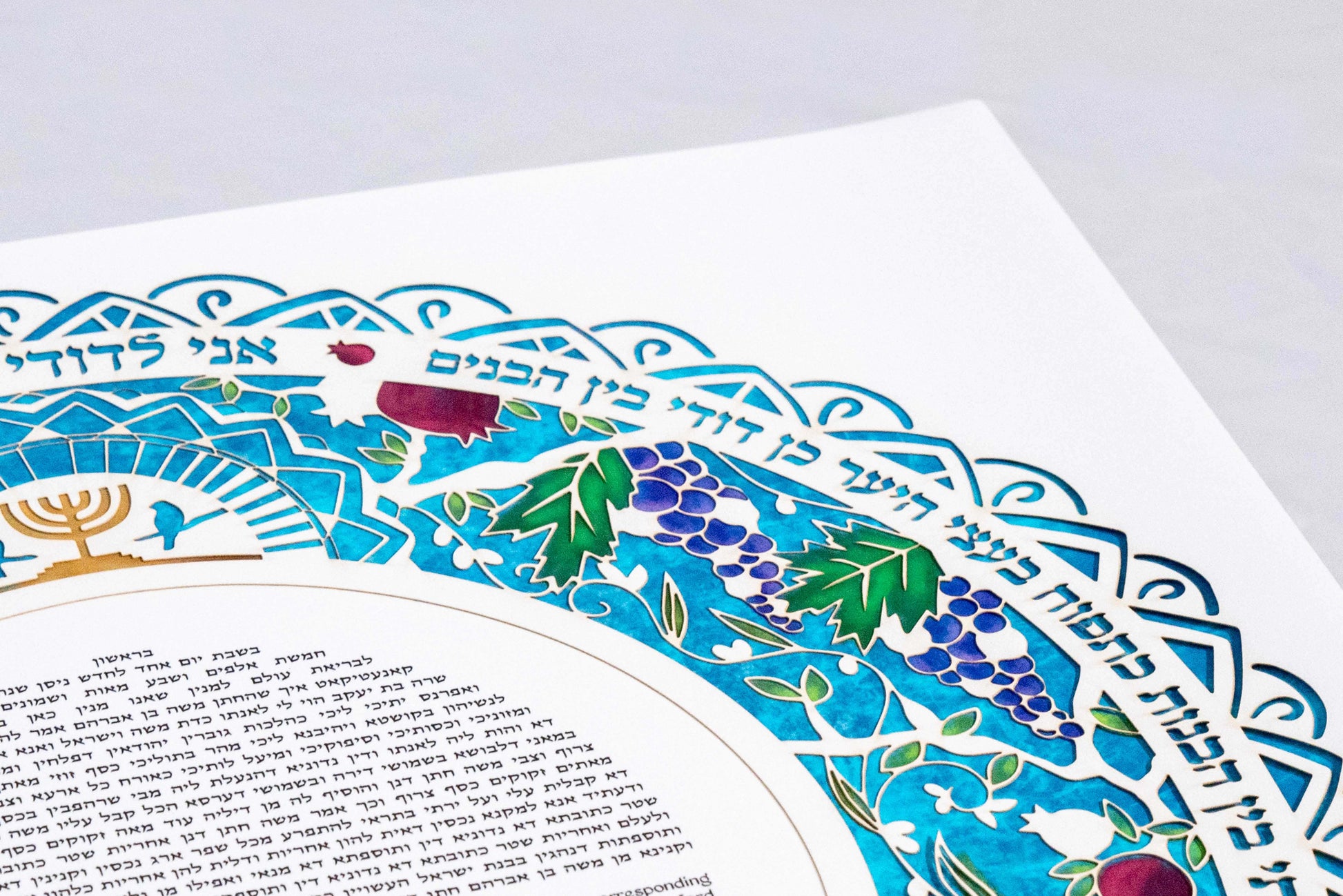 Experience the timeless beauty of the Papercut Fruit of the Orchard Ketubah, a masterpiece meticulously crafted by Sara Goldberg. Measuring 18 x 18 inches, this delicately cut papercut features intricate depictions of iconic fruits of Israel – pomegranates and grapes – intertwined with elegant leaves, all forming a stunning composition. At the top, a golden Menorah shines brightly, symbolizing tradition and unity. Choose between two background options: a colored, realistic portrayal or an all-blue rendition, both reproductions of Sara Goldberg's exquisite hand-painted watercolors. Elevate your wedding ceremony with this enchanting artwork, capturing the essence of love, heritage, and nature in every detail.