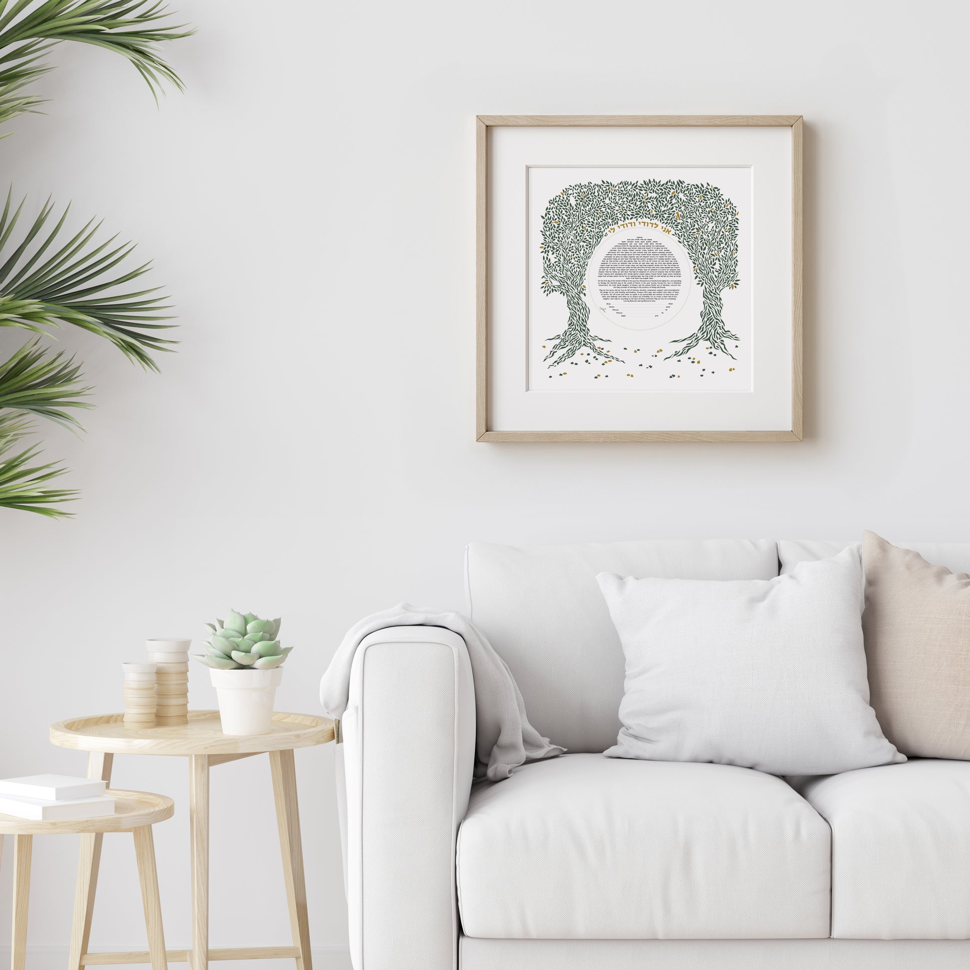 Introducing our exquisite Paper Cut Olive Tree Ketubah design, a stunning testament to love and commitment crafted with intricate detail and timeless elegance. This unique ketubah features two intertwining olive trees that merge into one at the apex, forming a graceful archway symbolizing the unity of two individuals embarking on a shared journey.
