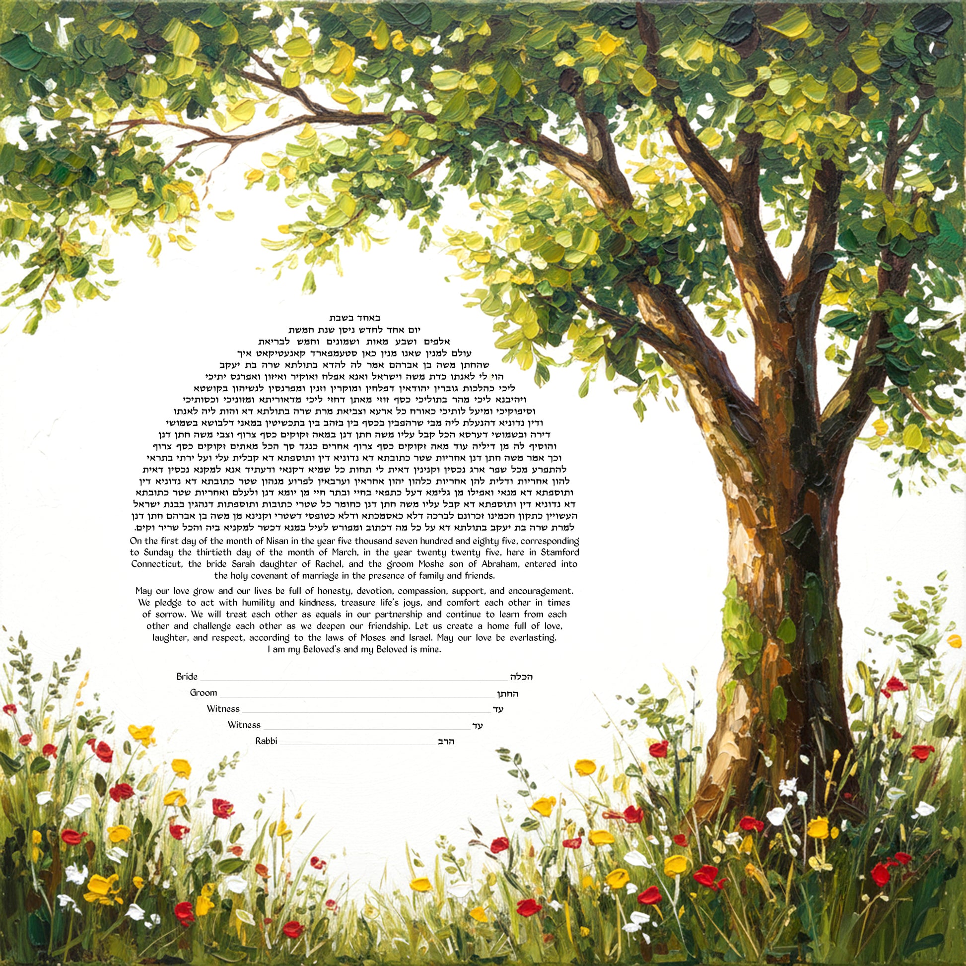 A vibrant green tree flourishes above a field of red, yellow, and white wildflowers, symbolizing growth, strength, and love. The wide white circle in the center provides an elegant space for your personalized ketubah text.