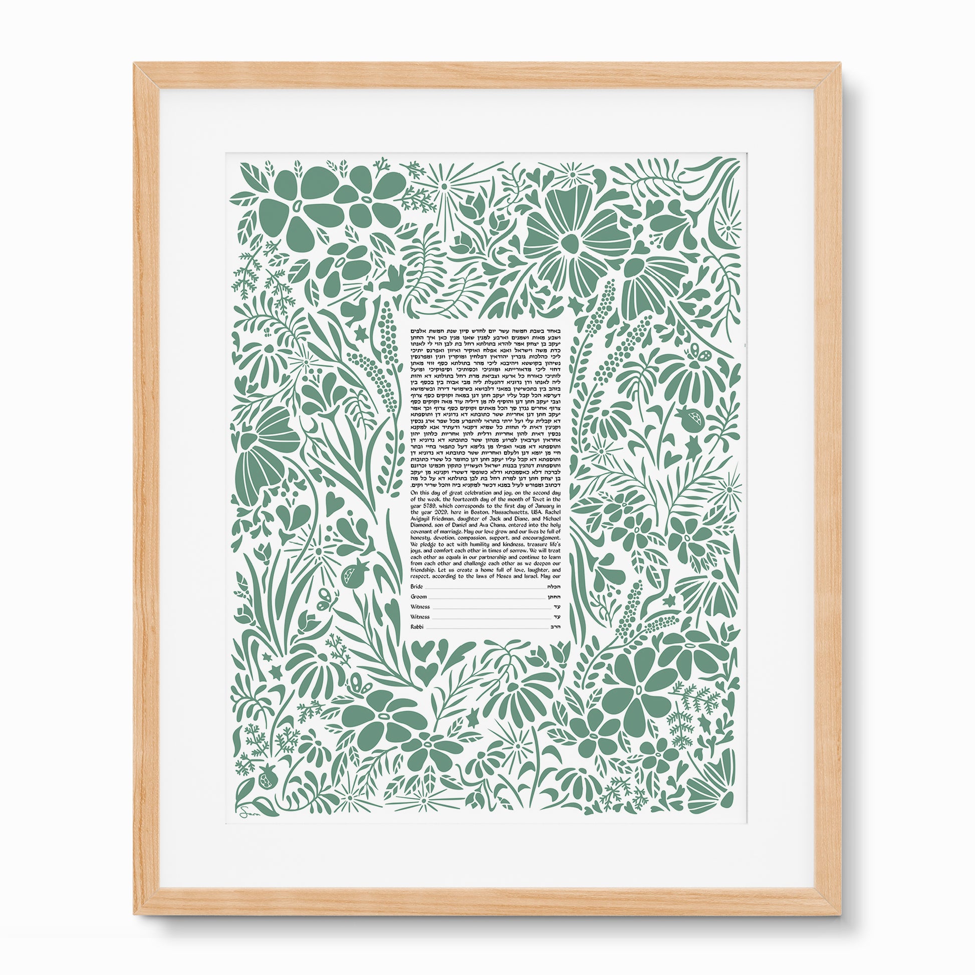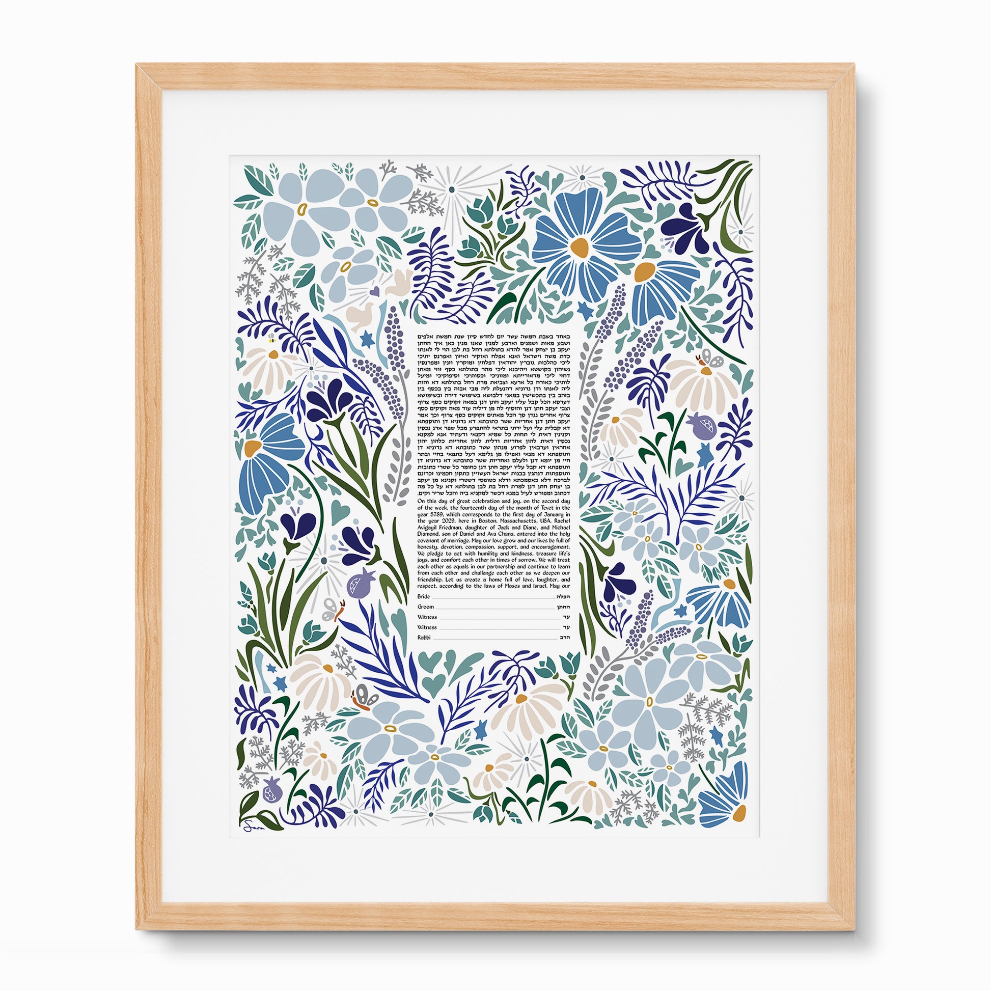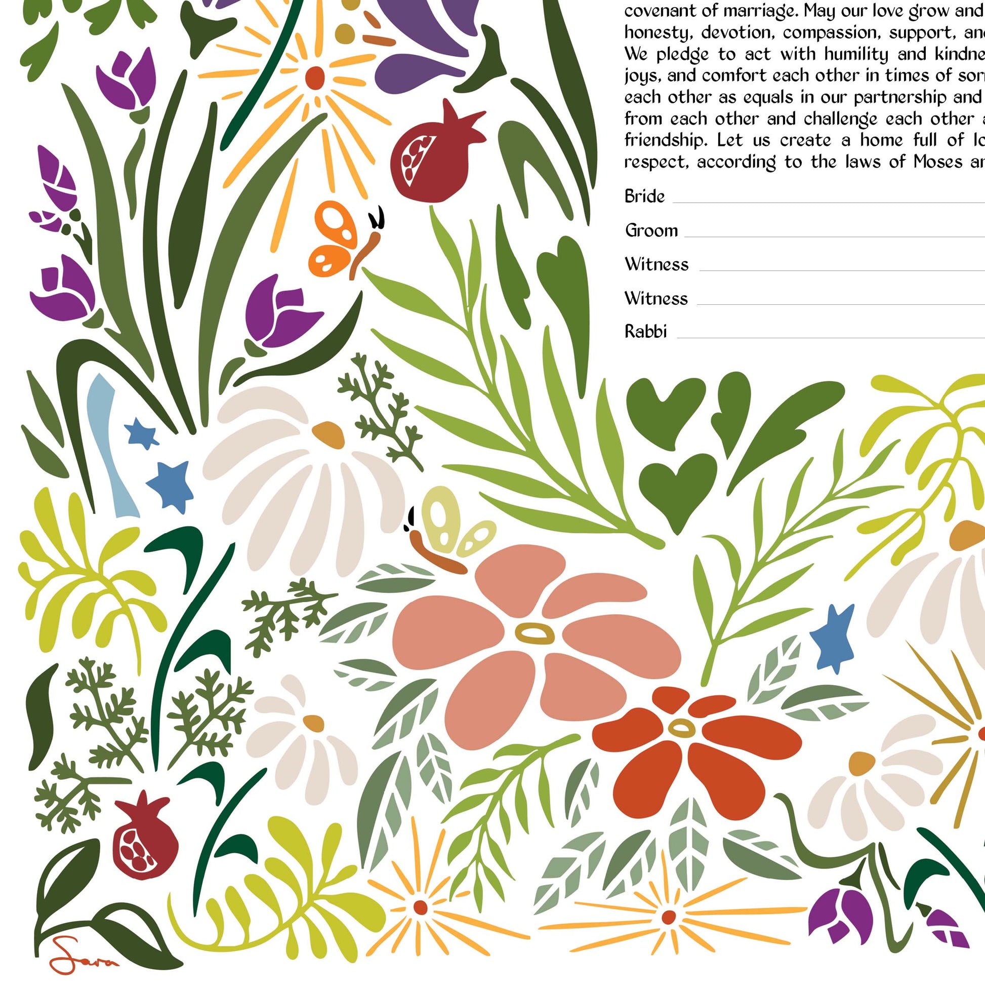 I drew the Wildflower Garden Ketubah with the intention of creating a piece that feels like a true wildflower garden while still carrying the soul of a traditional Jewish marriage contract.